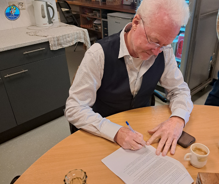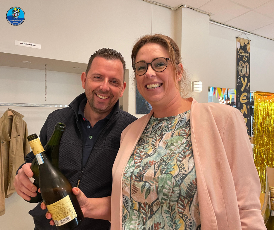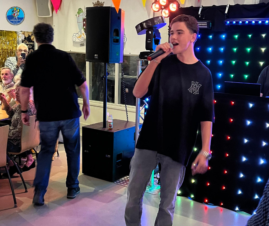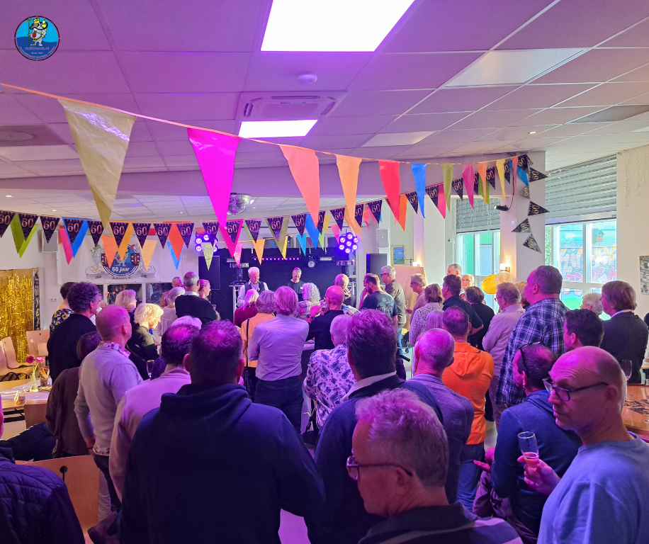 Nadat Ron Jonk ons had geinformeerd over de uitslag van de opiniepeiling naar aanleiding van de ingestuurde logo 's kon het feestgedruis beginnen. Goede muziek, de kleinzoon van Thea heeft ook opgetreden, die kan goed zingen zeg. En rond 21 uur een zanger met allerlei meezingers Van Tulpen uit Amsterdam naar Terug in de tijd en Zin in jou! Ik zag dat er zelfs polonaise werd gelopen. Gelukkig stond ik toen achter de bar samen met Marion.