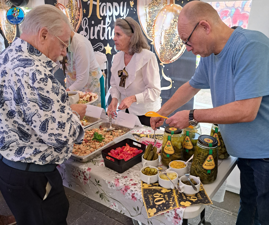 Wat was het een geweldig feest afgelopen zaterdag. Vanaf 15u werd al hard gewerkt aan de opbouw van de tenten, de muziek en het ophangen van allerlei feestartikelen. Het resultaat mocht er zijn, het zag er allemaal geweldig uit. Bij binnenkomst werden wij enthousiast ontvangen door Karla, Ilse, Lisa, Biggy (de catering girls). We kregen een welkomstdrankje van Patricia en Peter wees ons de weg naar Jolanda die ons (nog op ons mooist) op de foto heeft gezet.